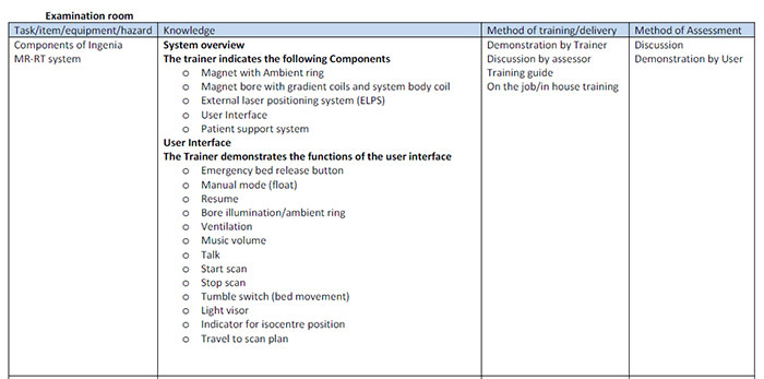 with “MR local rules” governing regulatory requirements for safety in the PBT department; helping recruit the therapeutic and diagnostic radiographers comprising the permanent PBT pre-treatment team; assisting in identifying training needs; safety training; and developing the initial sequences with the Philips applications training team and other pre-treatment team radiographers.